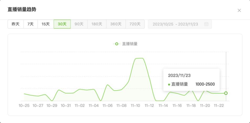 飛瓜數(shù)據(jù)顯示,自10月25日至11月23日,近一個月時間,張小泉僅11月10日、11月11日直播銷量在7500至1萬之間。至11月23日,張小泉直播銷量已恢復(fù)至近一月時間的銷量常態(tài),在1000至2500之間。
