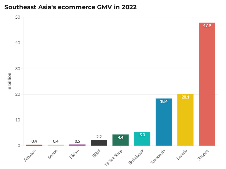 從規(guī)模來看,Shopee霸主地位也相當穩(wěn)固。數(shù)據(jù)顯示,Shopee東南亞2022年GMV規(guī)模達479億美元,占據(jù)當?shù)亟话胧袌龇蓊~,Lazada和Tokopedia則位列其后,三者共同瓜分了東南亞市場的半壁江山。