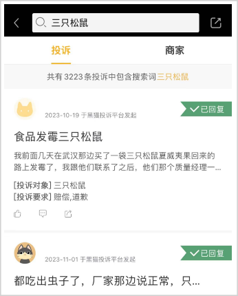 把生產(chǎn)環(huán)節(jié)交給代工廠,三只松鼠的“手”伸不到成本控制上,甚至也難以伸到食品質(zhì)量把控上。黑貓投訴上,有3000多條投訴中包含“三只松鼠”關(guān)鍵詞。在這些投訴中大部分是食品質(zhì)量問題,發(fā)霉、有蟲子、臨期食品中有異物、沒有生產(chǎn)日期……這些還只是普通的投訴,去年還有三只松鼠脫氧劑泄露致孕婦誤食的新聞登上熱搜。9月,又被曝出產(chǎn)品中吃出油炸壁虎。