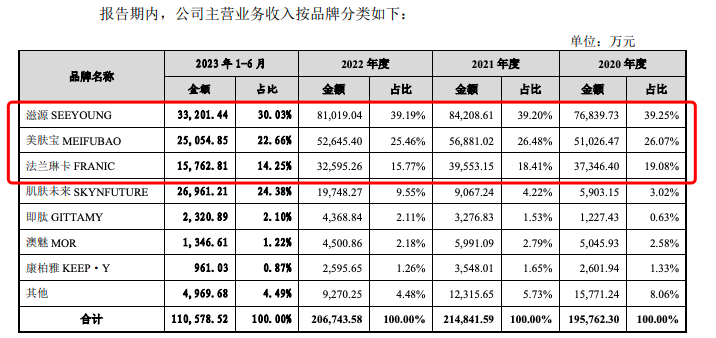 目前,滋源、美膚寶及法蘭琳卡三大主力品牌貢獻(xiàn)了主要收入。2020年至2022年,這三大品牌收入占比(總和)分別為84.39%、84.08%及80.42%。2023年1-6月,這三大品牌收入占比總和為66.95%。