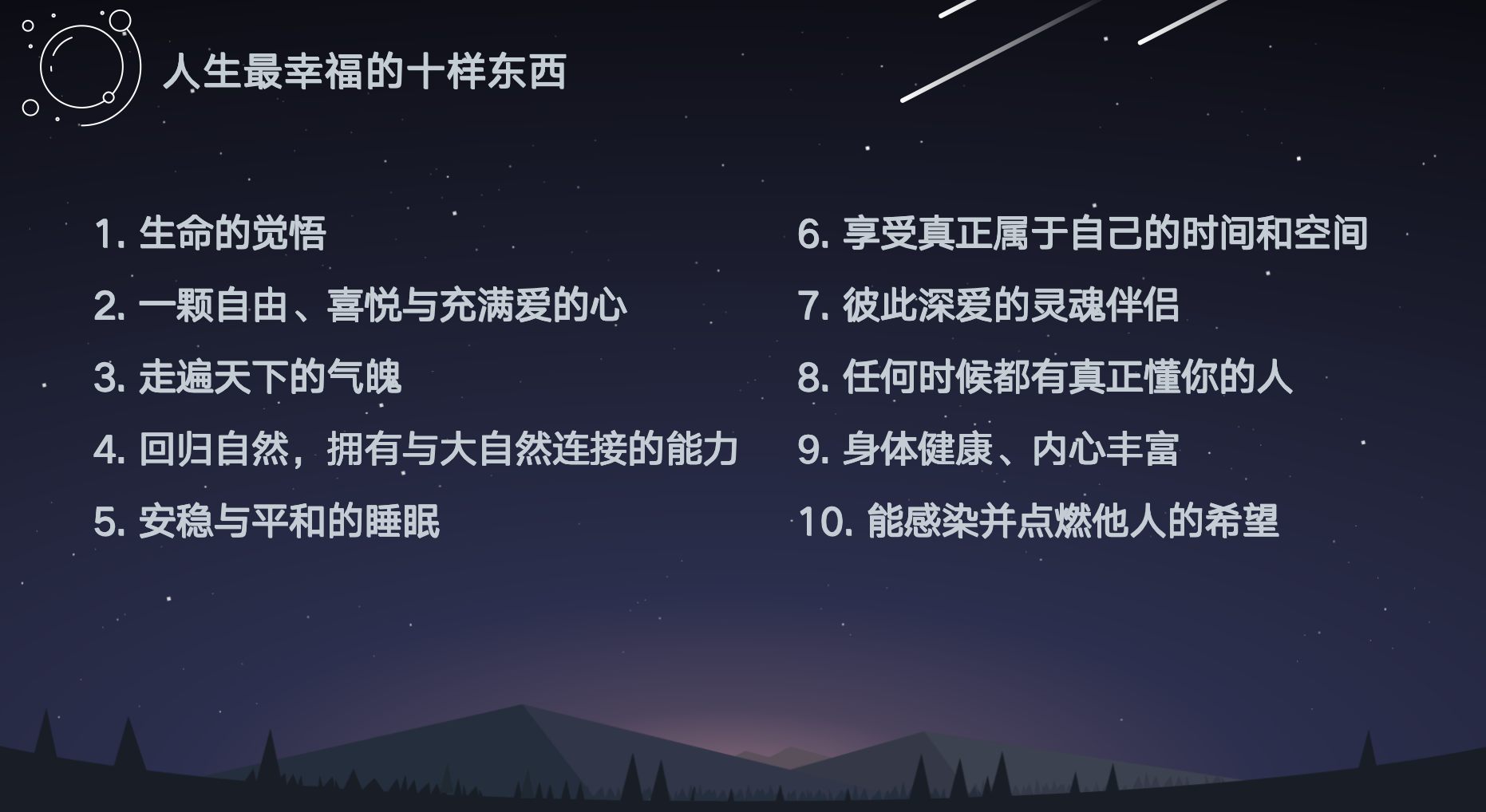 這是我看到的全世界人生最幸福的10樣?xùn)|西:1、生命的覺(jué)醒。2、一顆自由、喜悅和充滿(mǎn)愛(ài)的心。3、走遍天下的氣魄。4、回歸自然,擁有與大自然連接的能力。5、安穩(wěn)與平和的睡眠。6、享受真正屬于自己的時(shí)間和空間。7、彼此深?lèi)?ài)的靈魂伴侶。8、任何時(shí)候都能真正懂你的人。9、身體健康,內(nèi)心豐富。10、能感染并點(diǎn)燃他人希望。