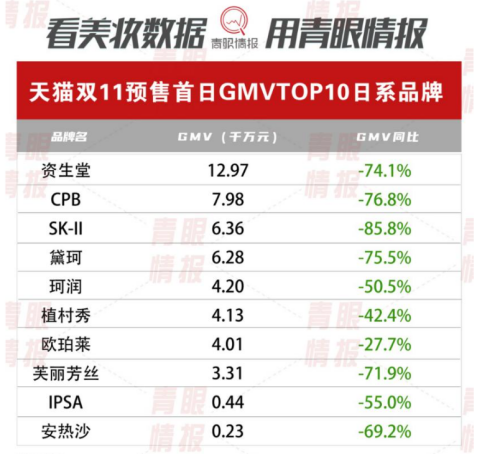 從天貓雙11預(yù)售成交金額來(lái)看,GMV前十的日系美妝品牌中,有8個(gè)較去年同比下滑超50%。其中,資生堂預(yù)售首日GMV為12.97億元,同比下滑達(dá)74.1%。旗下SK-II、肌膚之鑰(CPB)GMV也出現(xiàn)不同程度的下滑,跌幅分別為85.8%、76.8%。