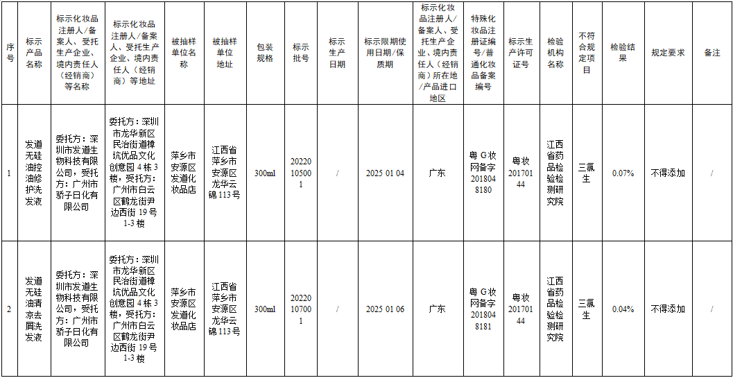 其中,“出現(xiàn)禁用成分”的現(xiàn)象主要集中在洗發(fā)液中。在11月21日發(fā)布的“9批次化妝品檢出禁用原料”通告中,“發(fā)道無硅油控油修護(hù)洗發(fā)液”、“發(fā)道無硅油清涼去屑洗發(fā)液”等三款產(chǎn)品被檢出添加了違禁成分“三氯生”。