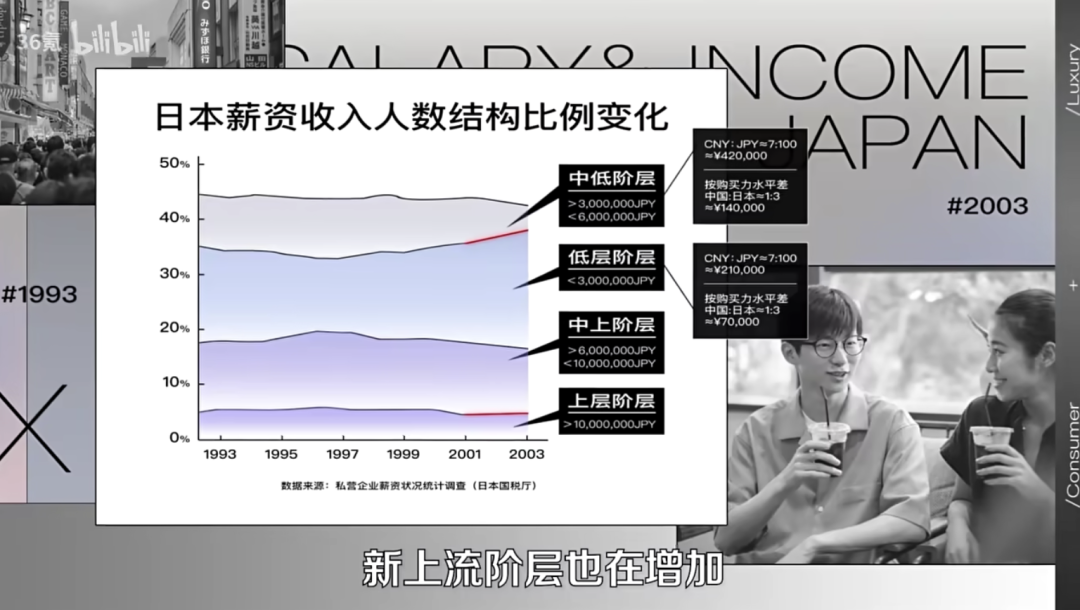 崩潰的中間階層,開始向低層和上層兩極移動,年收入小于600萬日元的中低收入階層,尤其是年收小于300萬日元的低收入階層越來越多的同時,以科技新貴和金融精英為首的新上流階層也在增加。