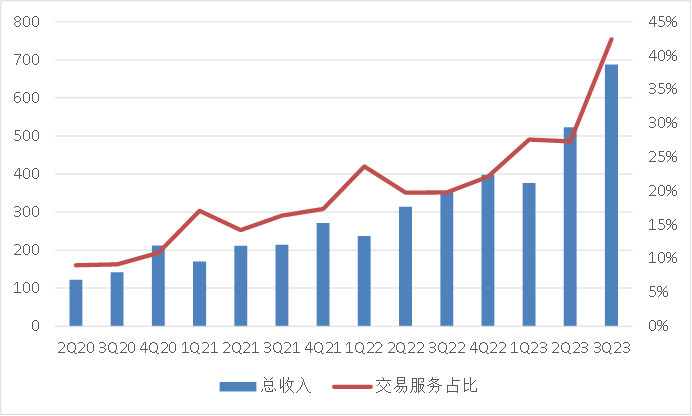 在拼多多最新的三季報(bào)中,其收入的高增,主要來自于交易服務(wù)的爆發(fā)。3Q23,重點(diǎn)拓展的交易服務(wù)同比大幅增長(zhǎng)315%至292億元,相較于上一個(gè)季度環(huán)比也大幅增長(zhǎng)了149億元。