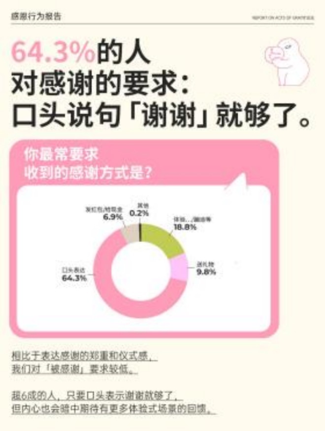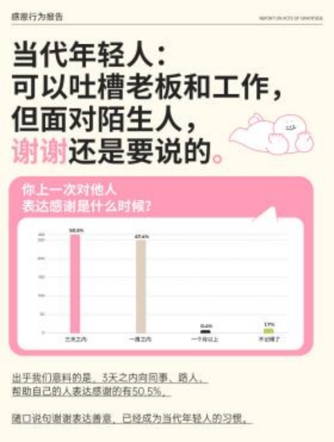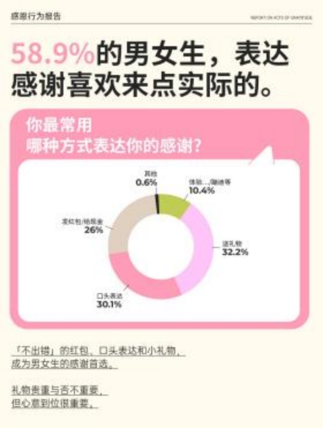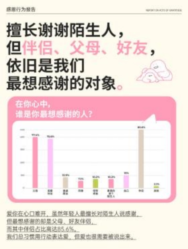 但要真正解決青年精神之困,還要以理想認(rèn)知還原青年行為。在深度分析后,合景泰富商業(yè)和北辰青年聯(lián)合分享青年人在感恩節(jié)的行為調(diào)查結(jié)果,發(fā)布了《全國(guó)青年感恩行為調(diào)查報(bào)告》。這一報(bào)告不僅僅是從大而泛的角度思考大眾情緒,更是通過(guò)理性的數(shù)據(jù)精細(xì)地觸達(dá)消費(fèi)者的情緒需求,進(jìn)一步升級(jí)合景泰富商業(yè)“溫暖”的形象,以青年圈層為原點(diǎn),提升在青年圈層中的影響力。
