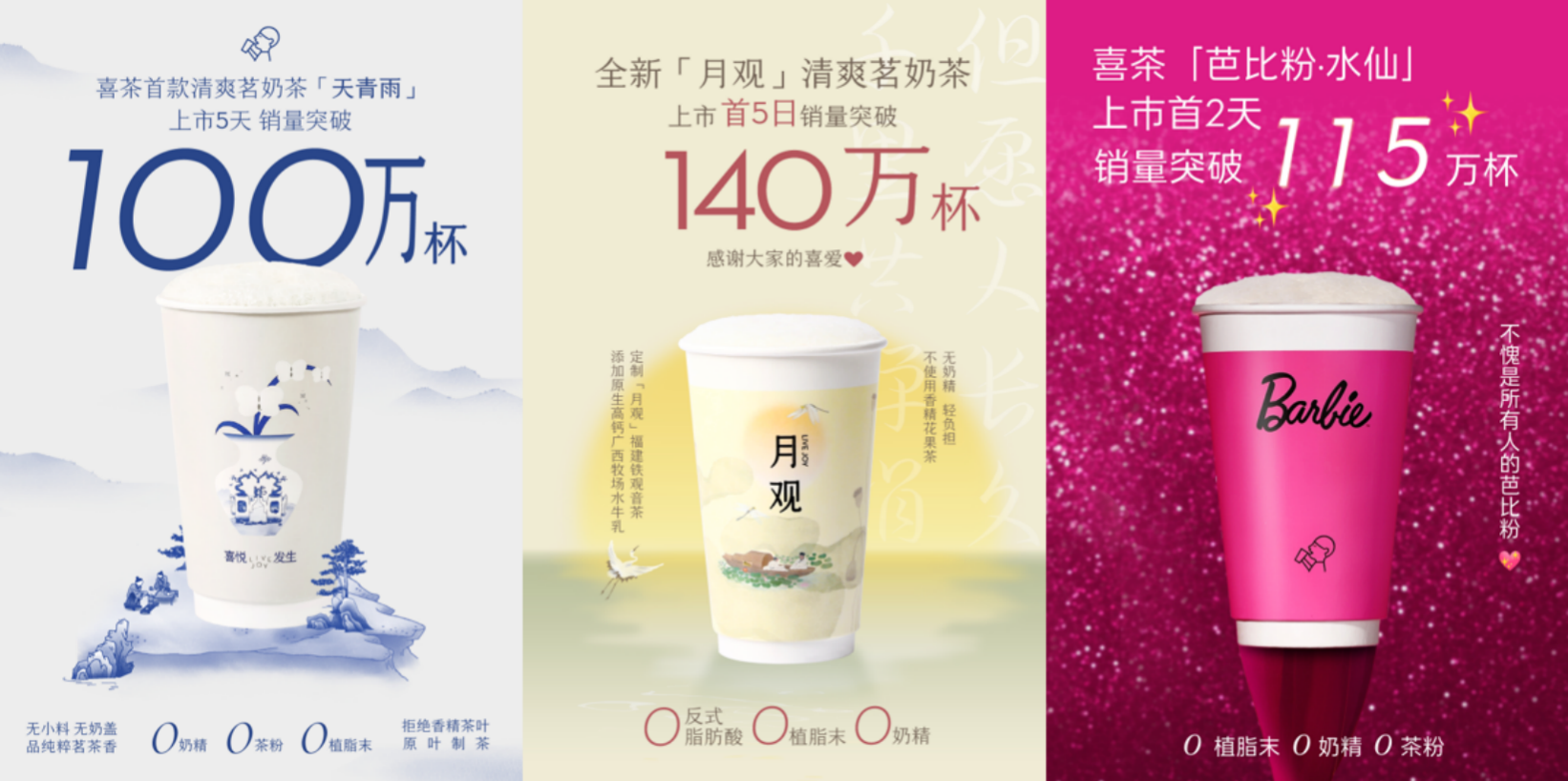 基于自身的產(chǎn)品創(chuàng)新研發(fā)實(shí)力,喜茶使用這些茶葉搭配真奶、真果等原料,推出了芝芝金鳳茶王等芝士茗茶系列、多肉葡萄等果茶系列、烤黑糖波波牛乳等牛乳茶系列、綠妍輕乳茶等輕乳茶系列等經(jīng)典產(chǎn)品。這些產(chǎn)品創(chuàng)新搭配展現(xiàn)了每款茶葉的獨(dú)特風(fēng)味,深受消費(fèi)者喜愛(ài)。今年以來(lái),喜茶延續(xù)輕乳茶系列推出的天青雨、月觀、芭比粉·水仙等茗奶茶產(chǎn)品,使用金牡丹烏龍茶、鐵觀音、水仙等無(wú)香精真茶底搭配真奶,帶來(lái)傳統(tǒng)茶葉的全新體驗(yàn),上市即火熱。其中芭比粉·水仙首周銷量近300萬(wàn)杯,刷新喜茶清爽茗奶茶系列最新銷售記錄。