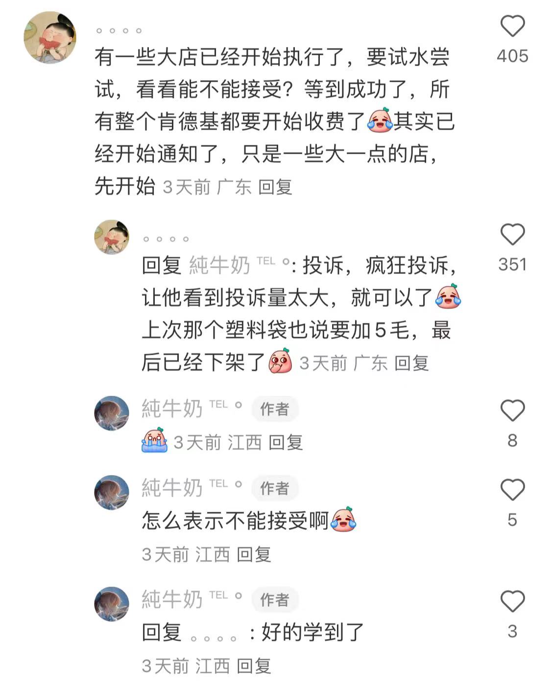 有網(wǎng)友在評論區(qū)透露“有一些大店已經(jīng)開始執(zhí)行了,要試水嘗試,看看能不能接受,等到成功了,所有門店都要開始收費了,其實已經(jīng)開始通知了,只是一些大一點的店先開始”,該網(wǎng)友還表示,“可以瘋狂投訴,之前的塑料袋也說要收5毛,最后已經(jīng)下架了”。