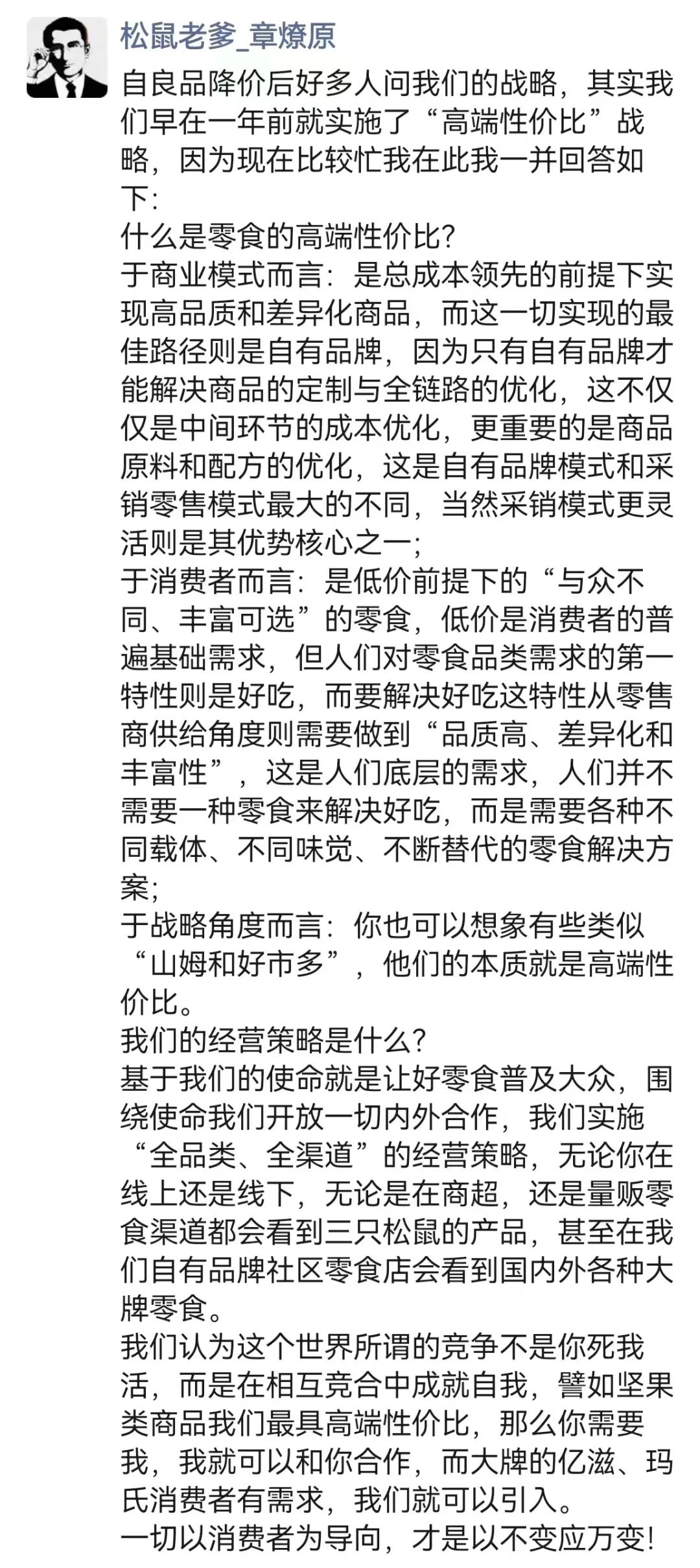 想清楚了一切,章燎原帶領(lǐng)三只松鼠回到用戶(hù)需求這個(gè)最簡(jiǎn)單的邏輯。2022年底,公司首次提出“高端性?xún)r(jià)比”,并將其作為三只松鼠最核心的戰(zhàn)略。