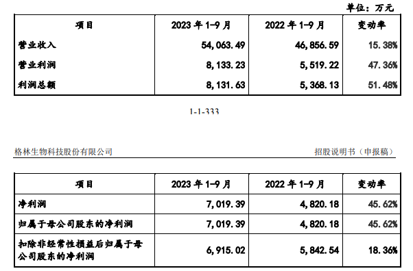 招股書顯示,格林生物在2023年前9個(gè)月共實(shí)現(xiàn)營收5.41億元,同比上漲15.38%;營業(yè)利潤同比上漲47.36%至0.81億元,凈利潤同比上漲45.62%至0.7億元。公司凈利潤增速快于收入增速,主要是因?yàn)殡S著上游原材料價(jià)格回落,公司原材料成本有所下降,此外,甲位突厥酮、突厥體烯酮等突厥酮系列高附加值產(chǎn)品銷售收入增加,從而毛利率增加所致。