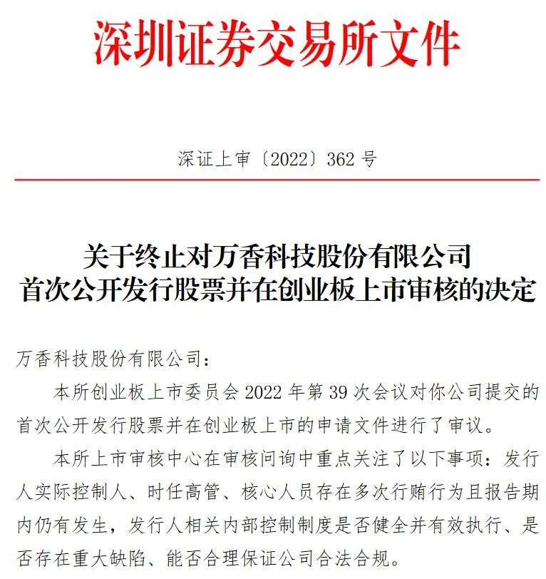 2020年12月,萬香科技提交的創(chuàng)業(yè)板IPO申請獲深交所受理。2022年,上市委員會(huì)審議未通過,對萬香科技首次公開發(fā)行股票并在創(chuàng)業(yè)板上市申請予以終止審核。原因是2005—2019年,公司的實(shí)際控制人、時(shí)任高管、核心技術(shù)人員涉及9項(xiàng)行賄事項(xiàng),且報(bào)告期內(nèi)仍有發(fā)生,不符合相關(guān)規(guī)定。