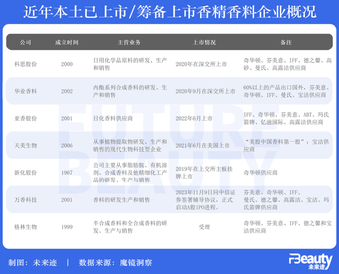 據(jù)《FBeauty未來跡》不完全統(tǒng)計(jì),2019年開始,新化股份、科思股份、華業(yè)香料、天美生物、亞香股份5家公司成功上市,萬香科技、格林生物在今年籌備上市。其中,新化股份是奇華頓供應(yīng)商,華業(yè)香料、科思股份、亞香股份、萬香科技、格林生物是“四大”的原料供應(yīng)商。