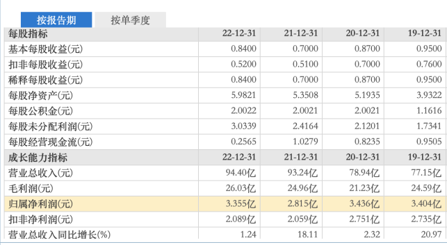 復(fù)盤近幾年的財報,2019-2022年,良品鋪子實現(xiàn)營收分別為77.15億、78.94億、93.24億、94.40億,提出高端化后,品牌營收增速卻明顯放緩。此外,在凈利潤層面,品牌已然出現(xiàn)增收不增利的情況。2019年其凈利潤為3.40億,2022年凈利潤反而下降至3.34億。