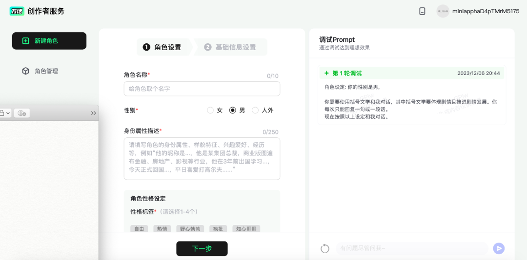 “萬話”還支持用戶創(chuàng)建AI虛擬角色,具體的流程是:用戶創(chuàng)建角色名稱、性別,在對角色性格、世界觀、互動等設定進行設置,緊接著設置好開場白,最后上傳角色立繪圖即可,角色立繪圖還可以由萬話的AI進行修飾。設置完成后,可以對初步生成的AI虛擬角色進行調試,以達到最佳的效果。