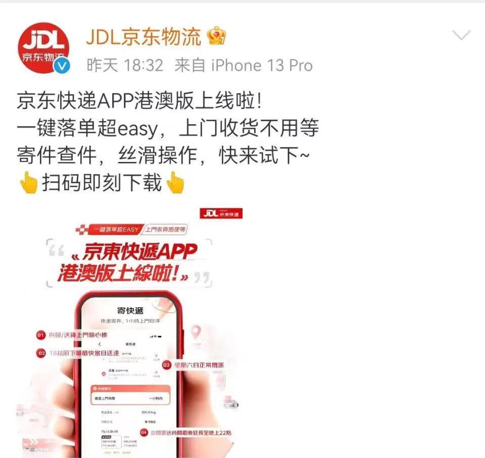 京東快遞APP港澳版上線 圖源:京東物流微博