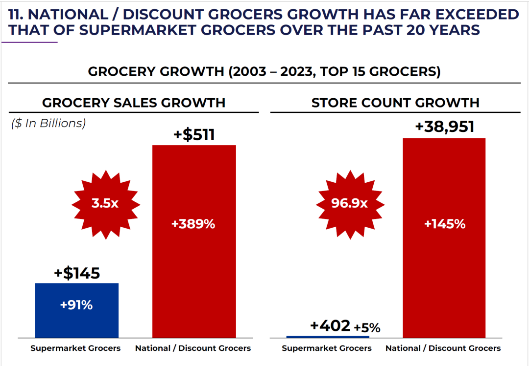 根據(jù)Solomon Partners的分析,從2003年到2023年,美國(guó)前15大食品零售商中,非傳統(tǒng)食品零售商增加了5110億美元的銷售額,增長(zhǎng)了389%,是超市增加的1450億美元的3.5倍,超市銷售額僅增長(zhǎng)了91%。門店數(shù)量上的差異更加明顯。在20年的時(shí)間里,全國(guó)型零售商/折扣店的門店數(shù)增長(zhǎng)了145%,共增加了38951家,是超市增加的402家商店的96.9倍,超市門店數(shù)僅增長(zhǎng)5%(見(jiàn)圖3、圖4)。