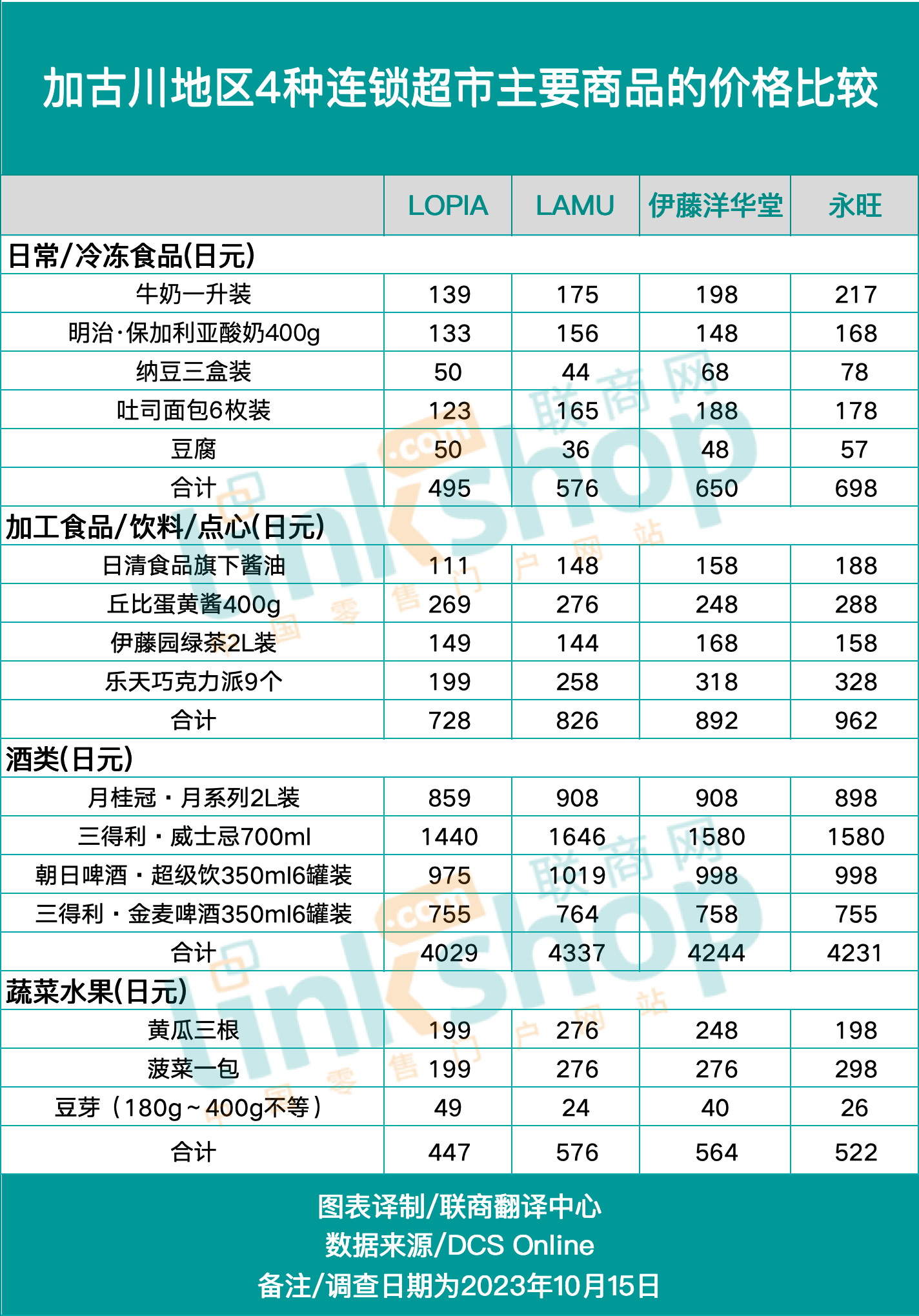 今年10月,LOPIA在日本關(guān)西加古川地區(qū)開設(shè)了新分店“LOPIA加古川大和屋敷店”,在開業(yè)之前,該地區(qū)已經(jīng)有LAMU、伊藤洋華堂和永旺三大連鎖超市各自占據(jù)一定的市場份額。為了確認LOPIA的定價政策,我們比較了四家超市的商品價格。
