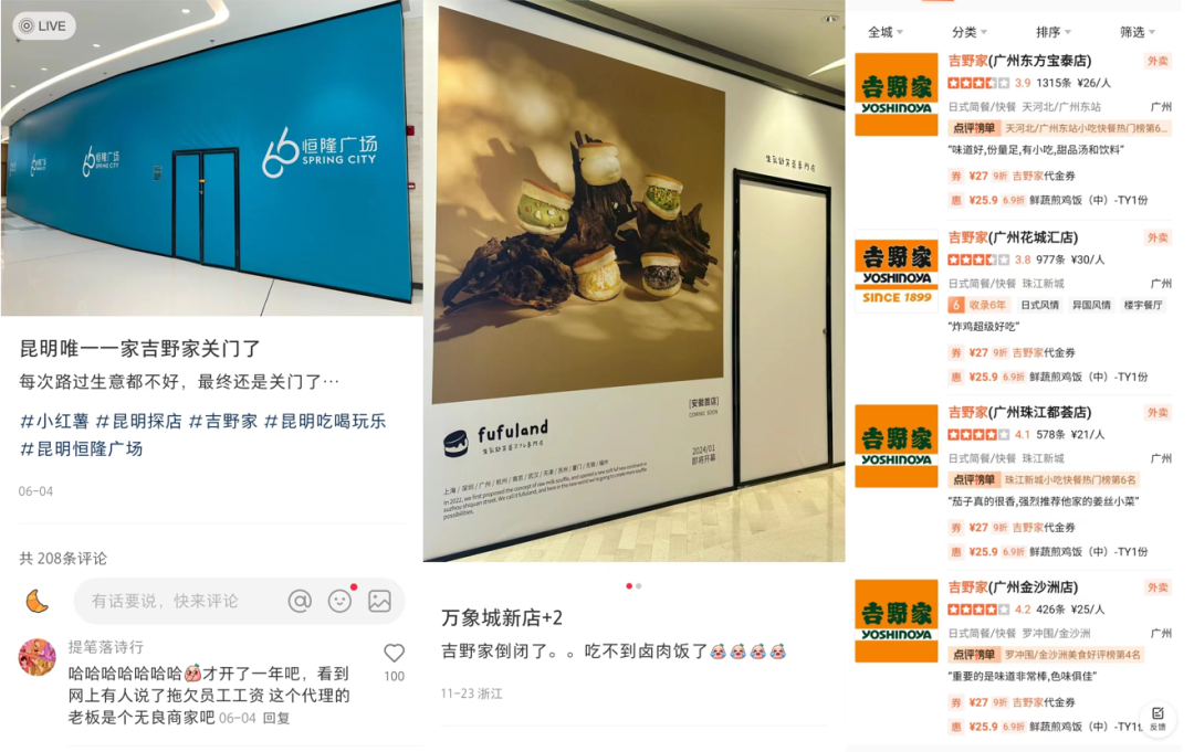 小紅書上也有很多網(wǎng)友在曬附近商場(chǎng)里的吉野家終于頂不住壓力退租關(guān)門了。
