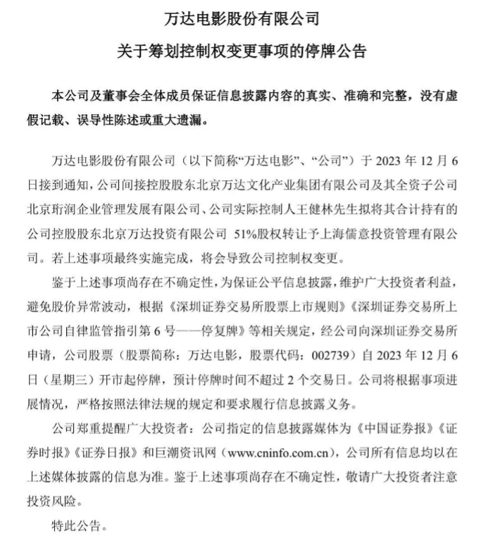 12月6日,萬(wàn)達(dá)電影突然停牌,給的理由是要籌劃控制權(quán)變更。緊接著,萬(wàn)達(dá)電影發(fā)布公告稱,公司實(shí)際控制人王健林先生擬將其合計(jì)持有的北京萬(wàn)達(dá)投資有限公司51%股權(quán)轉(zhuǎn)讓予上海儒意投資管理有限公司。