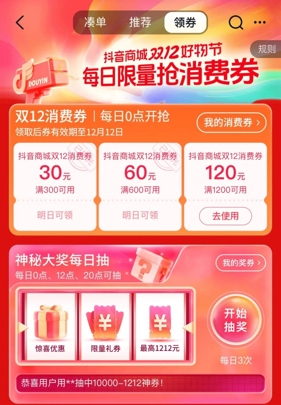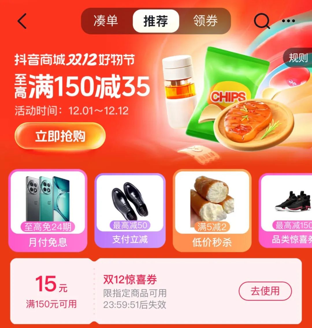 “記得領(lǐng)消費(fèi)券!痹谌豪锾嵝淹昱笥,手機(jī)時(shí)間剛好走過(guò)零點(diǎn),明笑打開(kāi)抖音,點(diǎn)開(kāi)商城,雙十二活動(dòng)的相關(guān)主頁(yè)映入眼簾,在“雙12消費(fèi)券”界面,三張消費(fèi)券整齊排列著,等待著她的領(lǐng)取。