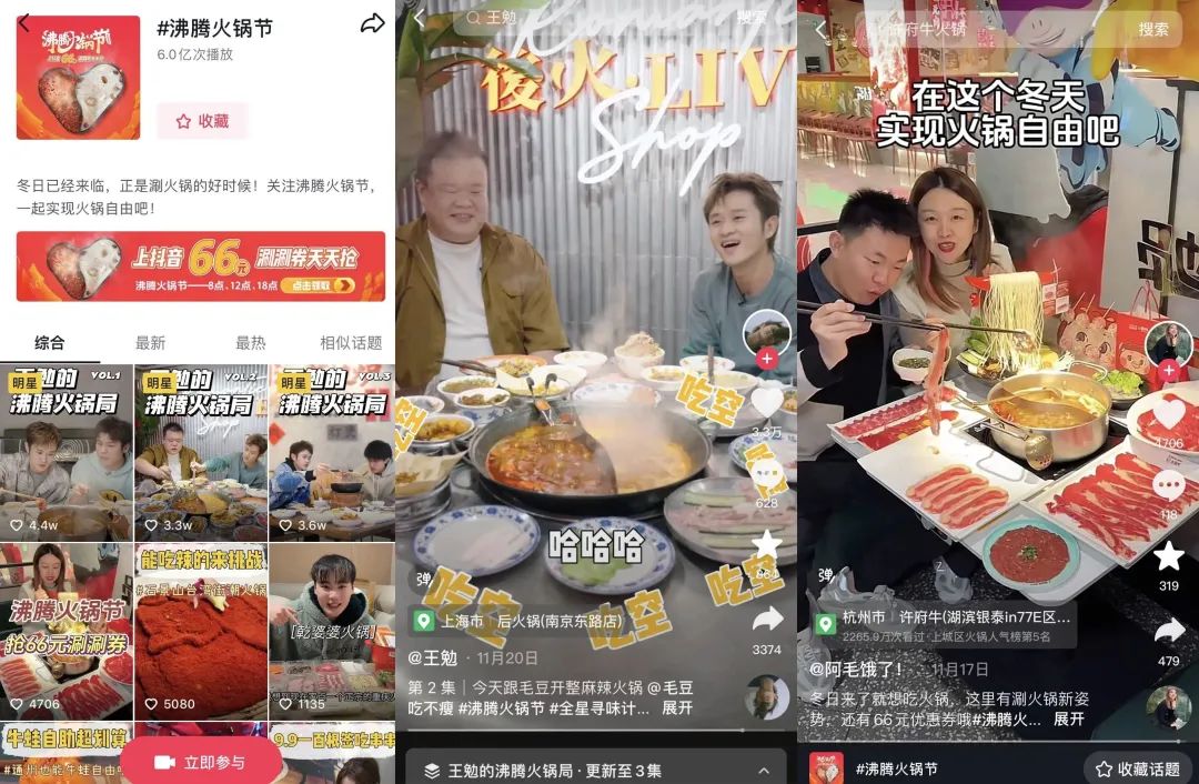 11月15日~28日,抖音生活服務(wù)發(fā)起“沸騰火鍋節(jié)”活動(dòng),截至目前,#沸騰火鍋節(jié)抖音話題吸引了3.6萬個(gè)內(nèi)容投稿,相關(guān)短視頻播放量近6億次,而#火鍋 這一話題播放量更是達(dá)到173億,讓火鍋品類在抖音徹底沸騰起來。
