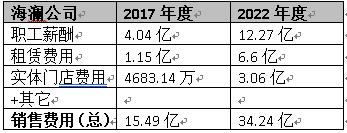 作為對比,2017年度,海瀾的銷售費用是約15.49億元;其中職工薪酬4.04億元,房租費用1.15億元,實體門店費用,4683.14萬元。