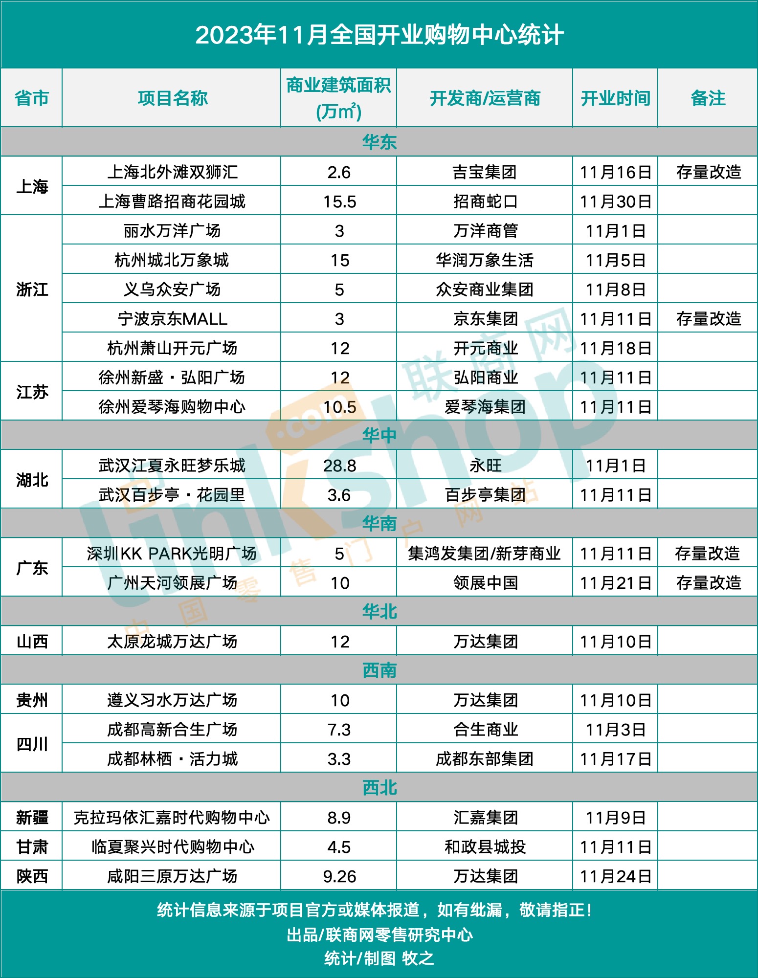 附:2023年11月全國(guó)新開購物中心統(tǒng)計(jì)表