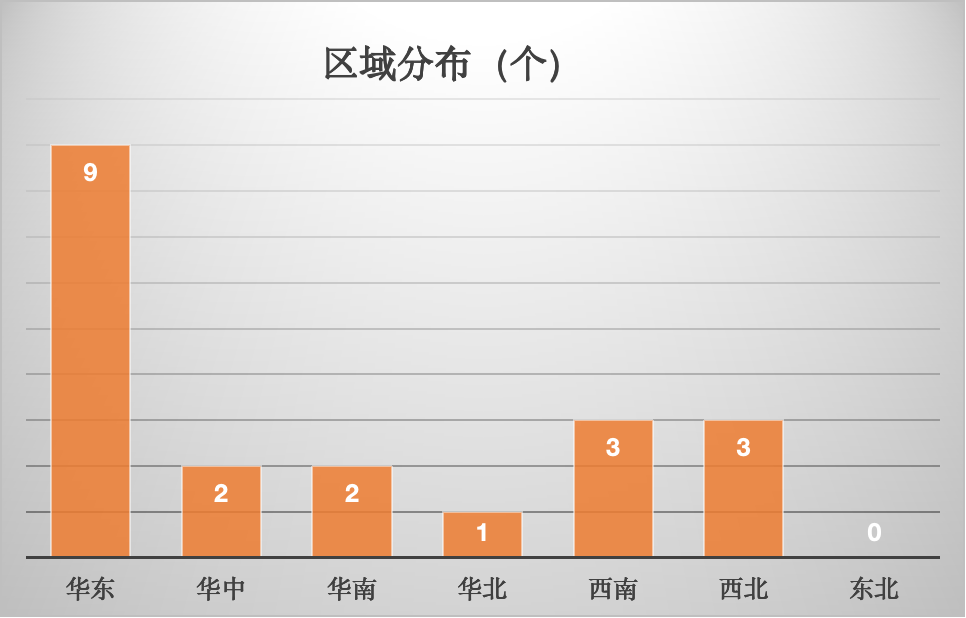 從區(qū)域來看,20個(gè)商業(yè)項(xiàng)目分布在六大區(qū)域,華東區(qū)持續(xù)領(lǐng)跑,有9個(gè)商業(yè)項(xiàng)目入市;西南、西北緊隨其后,均為3個(gè);華中、華南均為2個(gè),華北僅有1個(gè),東北區(qū)域交白卷。