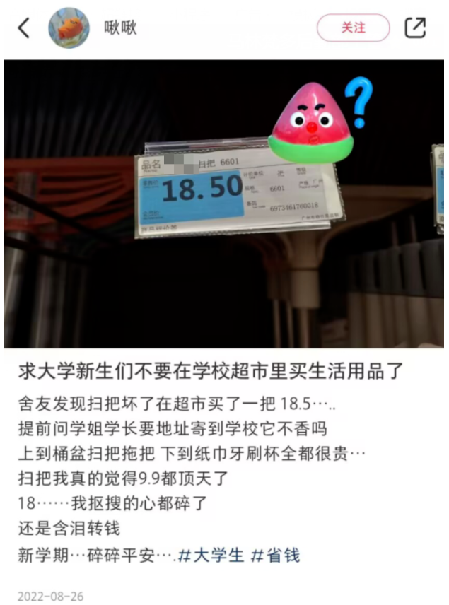 新學(xué)期伊始,首次開始獨立生活的大學(xué)生大多選擇就近在校園超市采買生活必需品,然而卻發(fā)現(xiàn)生活商品整體價格普遍高于校外超市與淘寶、拼多多等線上電商。