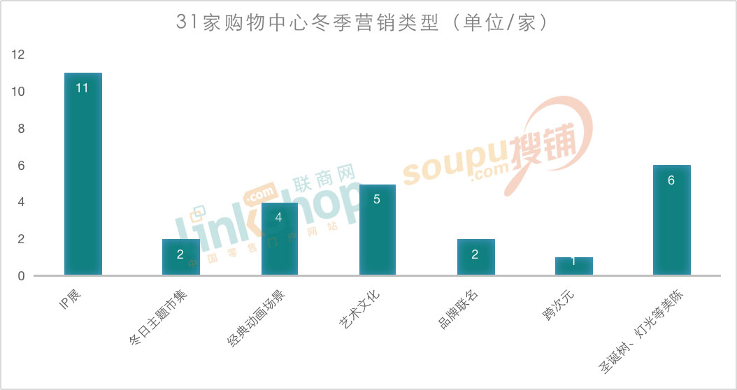 從統(tǒng)計的情況上看,企業(yè)和購物中心冬季營銷活動類別豐富,包括IP展、冬日主題市集、經(jīng)典動畫場景、藝術(shù)文化、品牌聯(lián)名、跨次元和圣誕樹、燈光等美陳等呈現(xiàn)方式。其中IP展是最常見的方式,超30﹪的商場選擇。