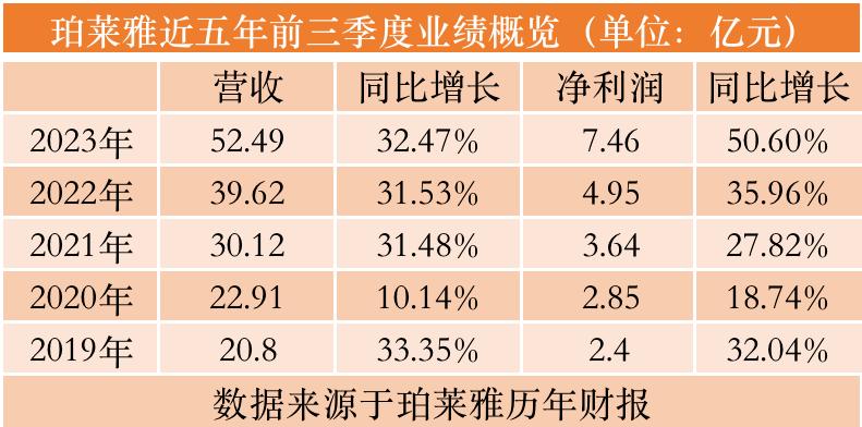 以珀萊雅為例。今年1—9月,珀萊雅業(yè)績創(chuàng)下歷史記錄:今年前三個季度,珀萊雅總營收錄得52.49億元,同比增長32.47%,這是珀萊雅首次前三季度營收突破50億大關(guān);同時,其凈利潤同比增長50.6%達(dá)7.46億元,這一增速也再創(chuàng)新高。