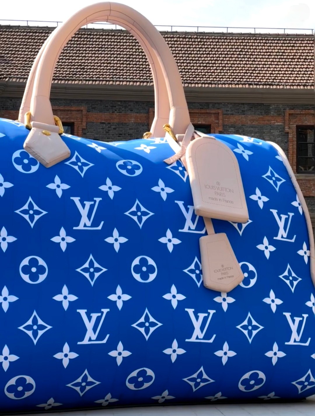LV前不久集中進(jìn)行了一波旅行主題的廣告活動(dòng),包括用標(biāo)志性的藍(lán)色刷滿蘇州河畔的一座紅磚瓦房的一整面墻;以及用巨大的3D品牌logo氣球,點(diǎn)綴杭州銀泰的圍擋——都是以非常直白且高調(diào)的形式進(jìn)入大眾視線。