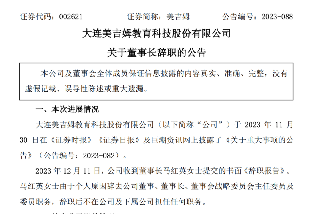 “早教第一股”美吉姆近日也被抬上了“風(fēng)口浪尖”,事件的起因是網(wǎng)絡(luò)上關(guān)于“美吉姆董事長‘跑路’”的消息甚囂塵上,隨后美吉姆發(fā)布了董事長離職的一紙公告算是對此事有個官方交代。