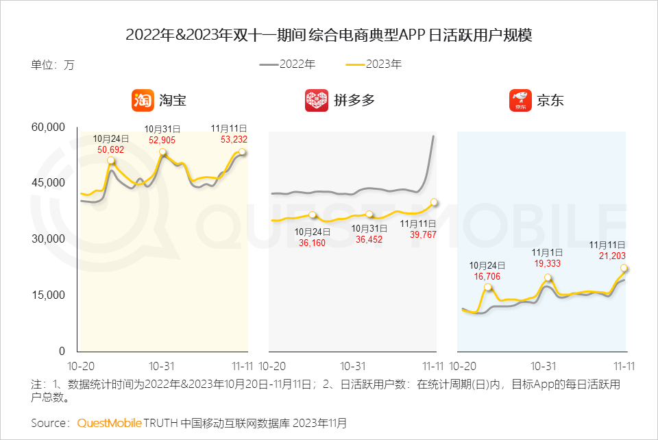 據(jù)第三方機(jī)構(gòu)Questmobile發(fā)布的《2023年雙十一洞察報(bào)告》顯示,今年雙11期間,淘寶與拼多多日活用戶規(guī)模均超過京東。