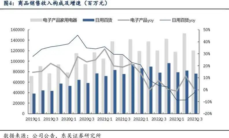 ▲圖:京東近三年商品銷售收入構(gòu)成及增速,圖源自東吳證券