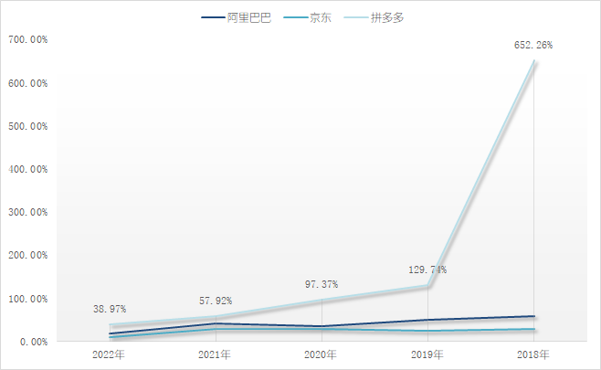 為了簡(jiǎn)單粗暴的比較三大電商平臺(tái)的核心收入增速,本文列出了近五年的營(yíng)收增速進(jìn)行對(duì)比?梢钥闯觯炊喽嗟臓I(yíng)收增速一騎絕塵,而“后起之秀”京東的收入增速也比不過阿里。