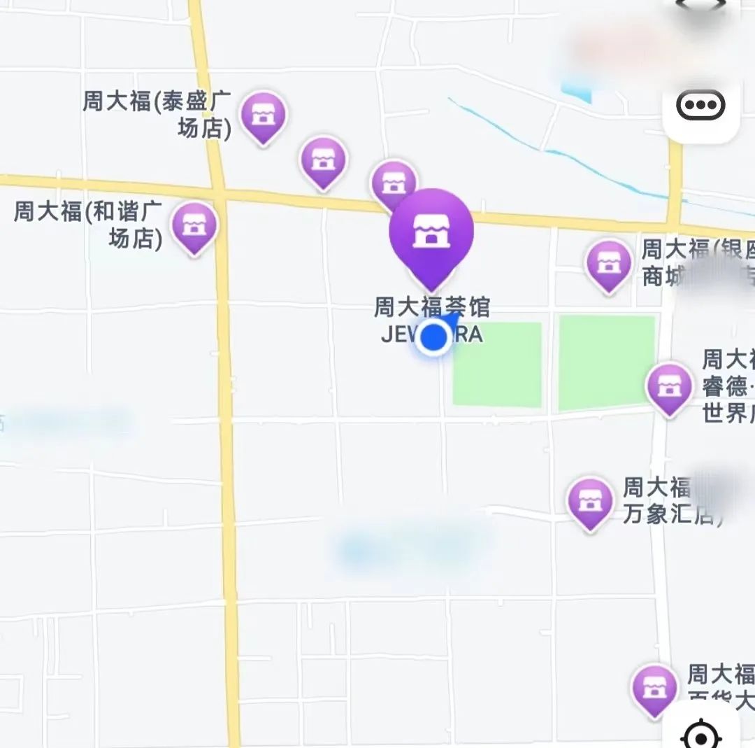 相較之下,夢(mèng)金園常年依靠加盟模式積累起的線下銷售網(wǎng)絡(luò),反而顯得略遜一籌。以山東某三線城市為例,在高德地圖上搜索“周大福”和“夢(mèng)金園”,夢(mèng)金園在市區(qū)內(nèi)的實(shí)體店大約有8家,周大福的實(shí)體店則有22家,僅核心商圈就有7、8家。