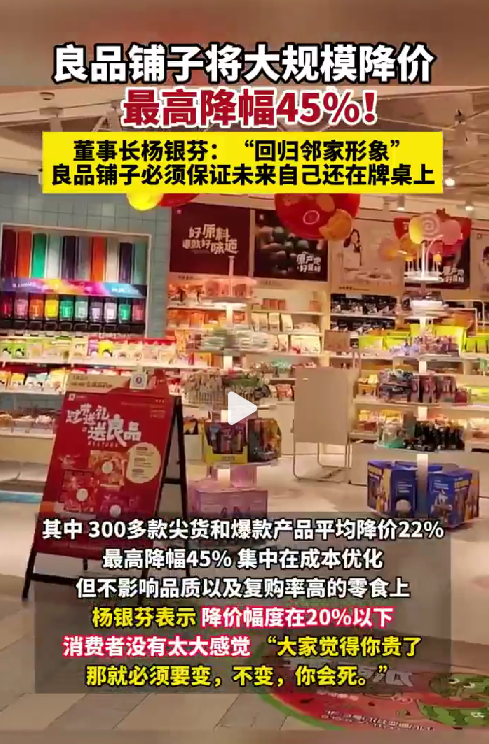 連“良品鋪子們”也被迫卷入戰(zhàn)場!300余款產(chǎn)品平均降價22%,最高降幅45%!绷计蜂佔有氯味麻L楊銀芬在近期的全員公開信中宣布進行17年來最大規(guī)模降價,稱良品鋪子正面臨“創(chuàng)業(yè)以來最艱難的挑戰(zhàn),是活不活得下去的問題”。