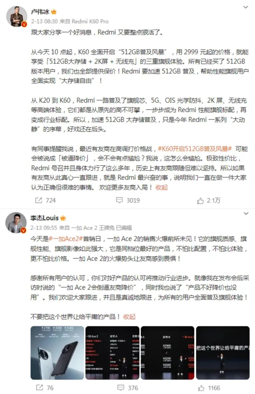 譬如2月初發(fā)布的一加Ace 2,16GB+512/256GB配置的定價為3499/3099元,12GB+256GB的定價下探至2799元;不久后紅米也開啟“512GB普及風暴”,Redmi K60所有512GB配置的版本降價300元,最低至2999元;4月發(fā)布的realme新款GT Neo5 SE,則直接將16GB+1TB配置的定價打到2599元,號稱“將滿級內(nèi)存越級到底”。