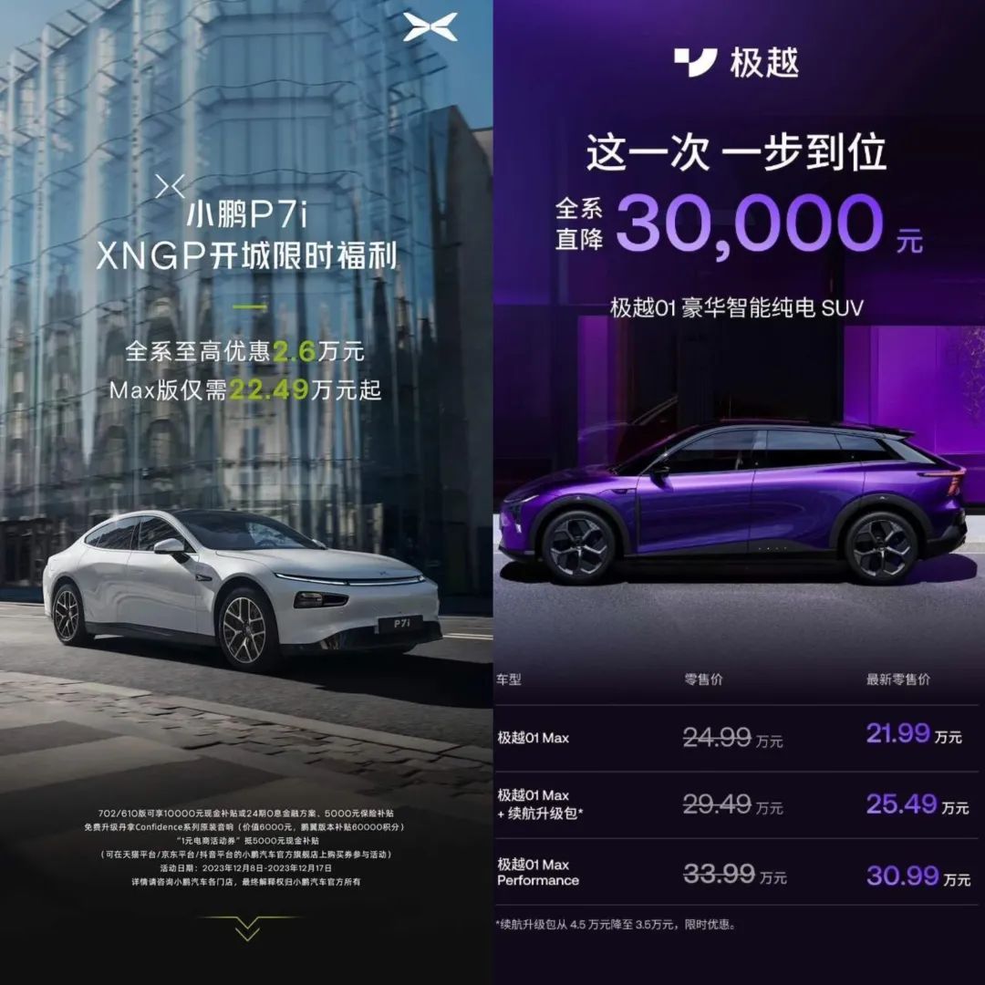 12月以來,包括比亞迪、極越、小鵬在內(nèi)至少有超過15個品牌推出各種折扣和優(yōu)惠活動,以便在年底狂攬一波銷量,普遍降幅在1-3萬元間;蛟S有意購車的消費者們,可以趁年底這波“交個朋友”。