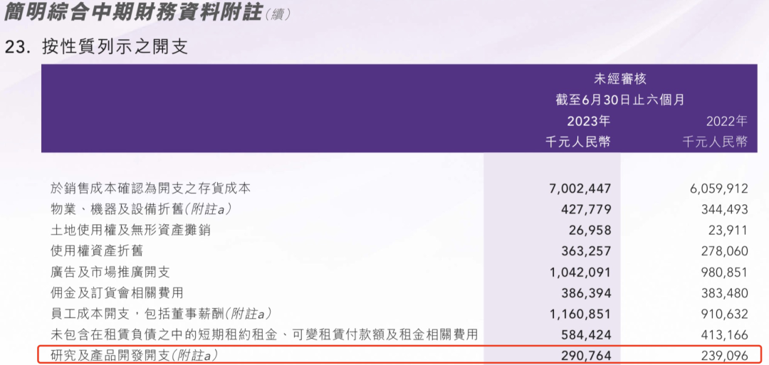 在2023年中報數(shù)據(jù)中,李寧研發(fā)費(fèi)用約2.91億元,同比增長21.76%,約占營收的比例為2.1%,雖較以往有所提升,但橫向?qū)Ρ葒鴥?nèi)品牌,其仍低于安踏體育的2.3%、特步國際的2.7%、361度的3.2%。