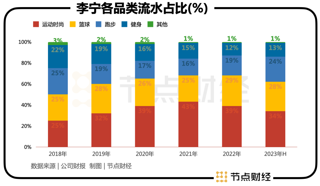 《節(jié)點財經(jīng)》通過分析李寧歷年的業(yè)務流水變化發(fā)現(xiàn),“運動時尚板塊的式微”或是關鍵。