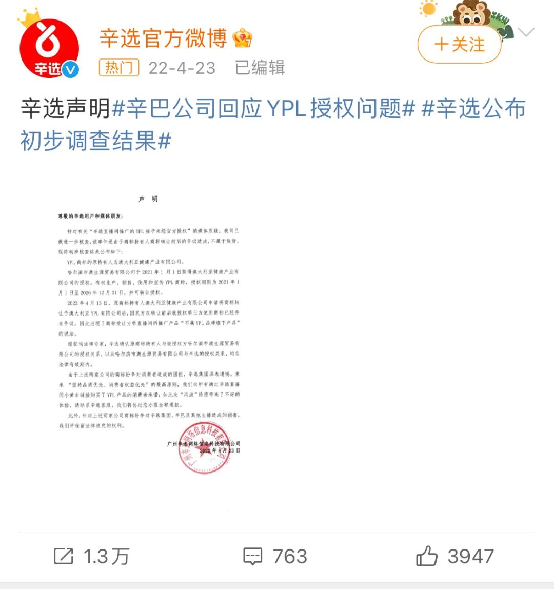 盡管辛選后來表示,該事件是由于商標(biāo)持有人商標(biāo)轉(zhuǎn)讓前后的爭議造成,也愿意為所有購買了YPL產(chǎn)品的消費(fèi)者辦理全額退款。但蛋蛋作為一位粉絲近億的頭部主播,在選品上出現(xiàn)這么低級的錯(cuò)誤,也不禁讓人懷疑,她是否擔(dān)得起快手一姐之名?