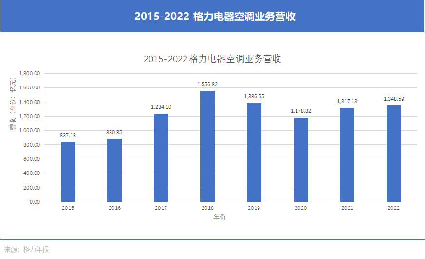 空調是格力的命脈,2022年在營收中占比為71.36%,然而,以最能打的拳頭產品空調來看,近三年,格力的空調營收也無明顯增長(見下圖)。就市場占有率來看,2022年,格力家用空調的市場占有率已經丟掉了市場第一的寶座。