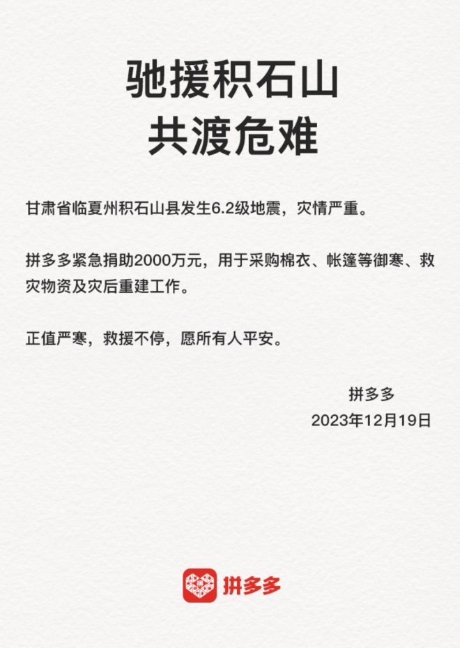 拼多多緊急捐贈(zèng)2000萬(wàn)元 馳援積石山共渡危難