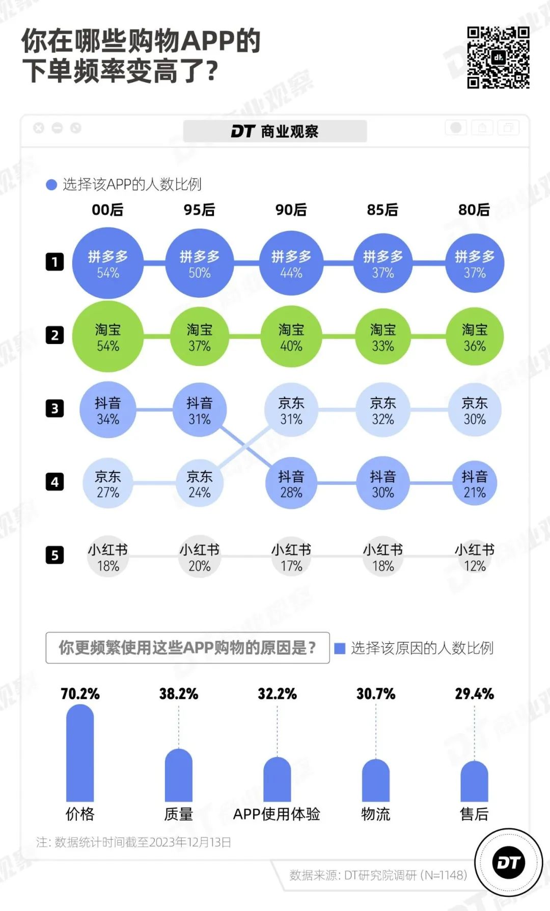 在公司層面,拼多多市值一度超過阿里;在消費者層面,拼多多在80后到00后全年齡段中,都排在了“下單頻率更高的APP”的第一位,且在00后(54%)和95后(50%)當(dāng)中最為明顯。