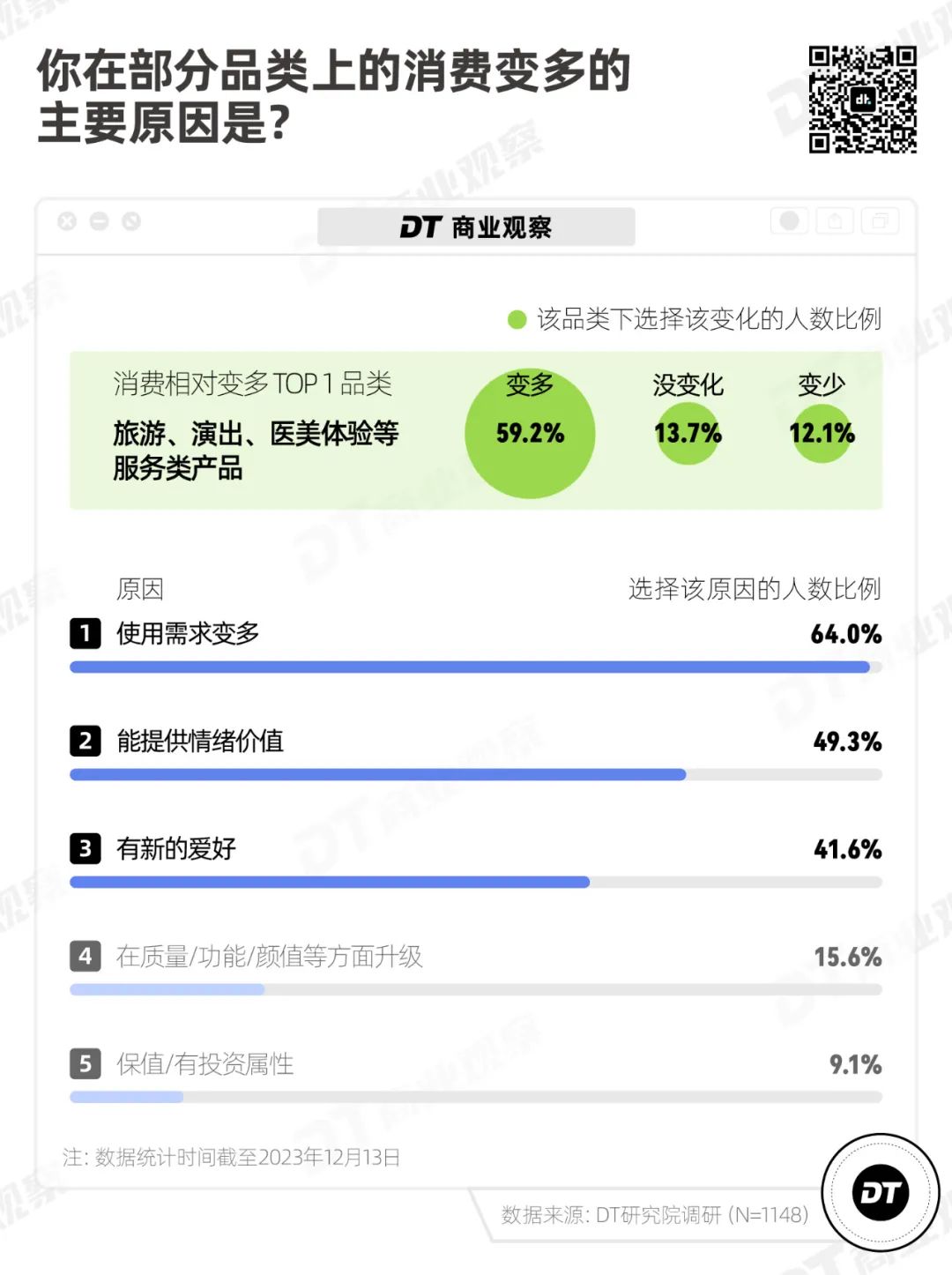 總的來看,開支增加的主要原因,是在精神生活上有更多追求。這種追求在年初時,可能更多是出于對疫情三年的“報復(fù)性出游”,到了現(xiàn)在,已經(jīng)逐漸轉(zhuǎn)變成了一種及時行樂的日常療愈。
