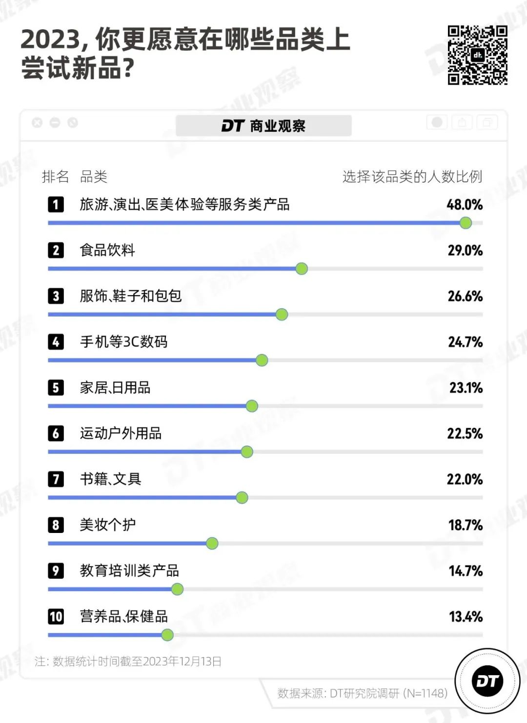 在人們樂意嘗新的品類中:仍然是服務(wù)類產(chǎn)品排在第一,其次是食品飲料,再之后才是服飾、鞋子和包包,美妝個護(hù)只排第八。