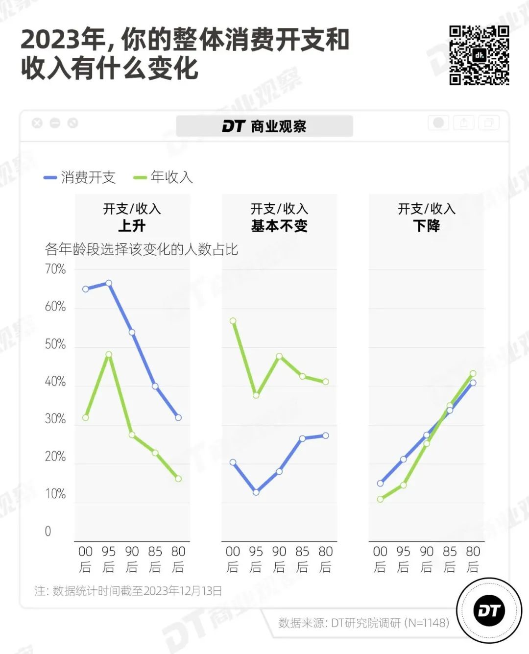 值得注意的是,這是受訪者自身情況的相對變化,并不意味著00后、95后的收入或支出的絕對值一定高于85后、80后。