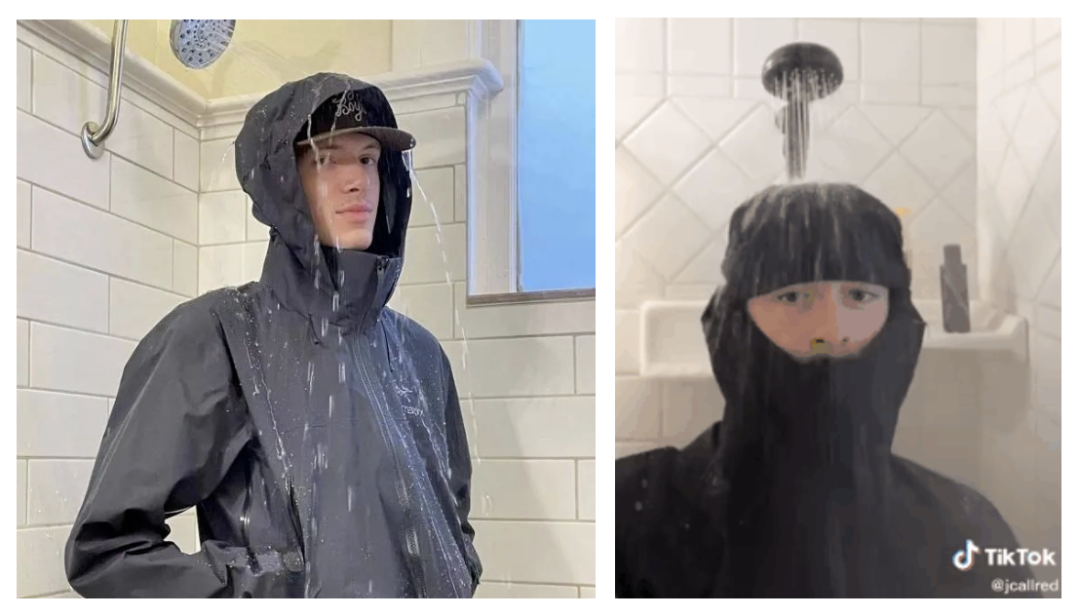 “場(chǎng)景化”最有代表性的例子,是2022年刷屏TikTok的始祖鳥(niǎo)“防水挑戰(zhàn)”,各大博主穿著沖鋒衣站到淋浴間,讓這大雨全部落下,展示其貌不揚(yáng)的鳥(niǎo)是多么防水。